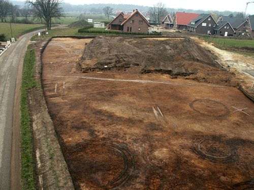 Im Juni 2003 sollte im Osten der Gemeinde Uelsen ein neues Baugebiet erschlossen werden. Nachdem die Erdarbeiten begonnen hatten, entdeckte ein Anwohner Tonscherben. Er bemerkte auch auffällige dunkle Flecken im rötlich-gelben Erdreich. Die Arbeiten wurden gestoppt und die herbeigerufenen Archäologen begannen mit weiteren Untersuchungen.