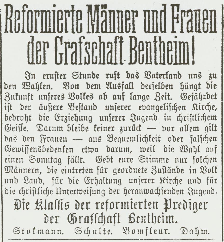 Die Grafschafter reformierte Klassis beurteilte die politische Lage ähnlich und erließ daher zur anstehenden Wahl der Weimarer Nationalversammlung zum ersten und einzigen Mal während der Weimarer Republik einen am 11. Januar 1919 in der Neuenhauser „Zeitung und Anzeigeblatt“ veröffentlichten Wahlaufruf: