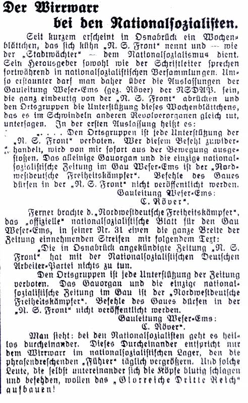 Mit zunehmendem Wachstum der Partei im Süden des Gaus, also im Osnabrücker Land und in der Grafschaft, wuchs die Unzufriedenheit im Regierungsbezirk Osnabrück über das Oldenburger Parteiorgan, da man in ihm die eigenen Belange nicht genügend gewürdigt sah. So brachte die Osnabrücker NSDAP-Leitung im August 1930 selbst eine nationalsozialistische Wochenzeitung für den Regierungsbezirk Osnabrück heraus, die „NS-Front“. Das eigenmächtige Vorgehen der Osnabrücker NSDAP-Bezirksleitung erboste allerdings Gauleiter Carl Röver, der dafür sorgte, dass die „NS-Front“ bald wieder eingestellt werden musste. Wie lange das Blatt existierte, ist nicht bekannt, da noch kein Exemplar ausfindig gemacht werden konnte. Seine Existenz hat jedoch Niederschlag in Akten und in der gegnerischen Presse gefunden.