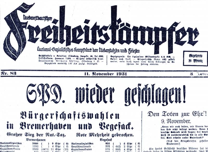 Als offizielles Parteiblatt für Norddeutschland fungierte als erstes der in Hannover erscheinende „Niedersächsische Beobachter“. Jedoch war er im Gau Weser-Ems kaum verbreitet. So schuf Gauleiter Carl Röver 1929 für den Nordwesten ein eigenes Parteiblatt, den „Nordwestdeutschen Freiheitskämpfer“. Herausgegeben wurde er von der Gauleitung in Oldenburg. Leider ist das für die Erforschung der Parteigeschichte des Gaus so wichtige Blatt vor 1933 bis auf wenige Einzelexemplare verschollen. Gelegentlich berichtete es sehr ausführlich aus der Grafschaft, so etwa in der Ausgabe vom 11. November 1932 über die Beerdigung des Schreinermeisters Johann Tückers aus Gildehaus. Der SA-Sturmführer hatte sich auf dem Höhepunkt der Weltwirtschaftskrise aus Verzweifelung über seine wirtschaftliche Not das Leben genommen. Sein Begräbnis nutzten hochrangige NS-Politiker zu heftigen Angriffen gegen das „Weimarer System“.