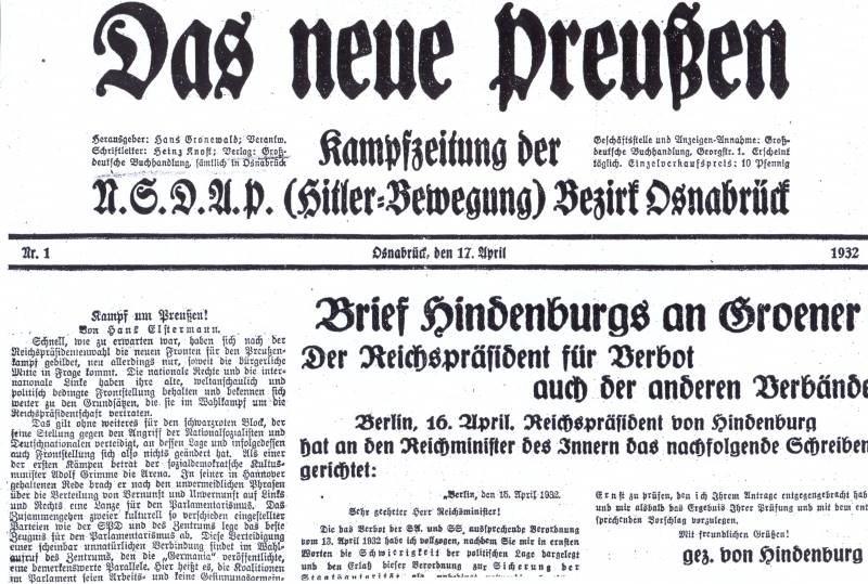 Unter dem Namen „Das neue Preußen. Kampfzeitung der N.S.D.A.P. (Hitler-Bewegung) Bezirk Osnabrück“ sollte es der Agitation der Partei auch im Bentheimer Land noch stärkeren Schwung verleihen. Zwar war die Oldenburger Gauleitung darüber erneut wenig begeistert, doch bevor Gauleiter Carl Röver reagieren konnte, hatten die staatlichen Behörden bereits Fakten geschaffen. Wegen des aggressiven Kurses des Blattes gegen die staatlichen Institutionen und Repräsentanten verbot der Oberpräsident in Hannover kurz nach seinem Erscheinen das Blatt gleich für etliche Tage. Da von dieser NS-Hetzschrift offenbar nur ein Exemplar überliefert ist, kann nicht gesagt werden, ob es danach erneut erschien und wie lange das Blatt überhaupt existierte.