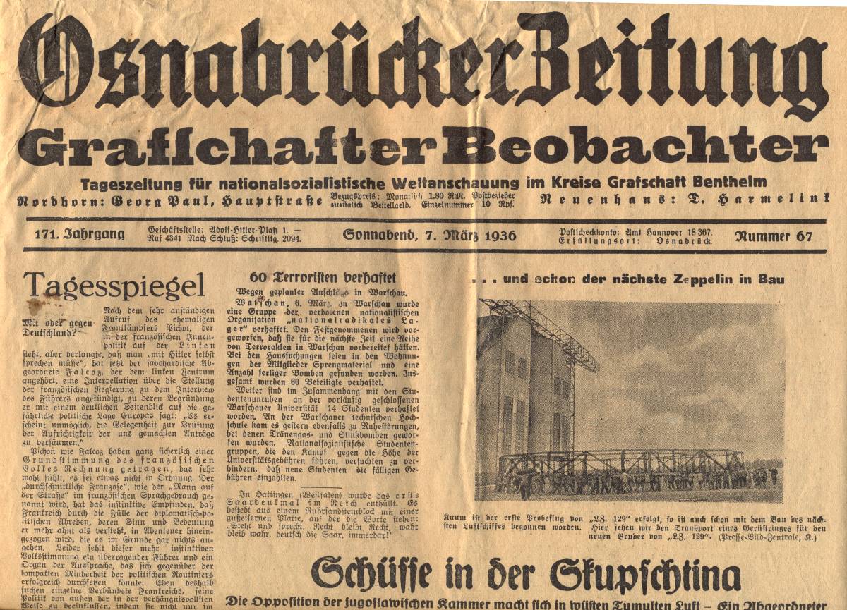Die letzte überlieferte Ausgabe stammt vom März 1936. Nun war der Titel des Stammblattes „Osnabrücker Zeitung“ in den Kopf des Blattes nach oben gerutscht. Darunter ist zu lesen: „Tageszeitung für nationalsozialistische Weltanschauung im Kreise Grafschaft Bentheim“. Das Büro in der Nordhorner Hauptstraße leitete inzwischen ein Georg Paul, ein zweites befand sich in Neuenhaus unter Leitung von D. Harmelink.