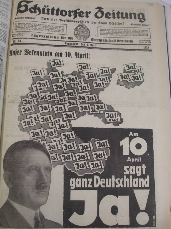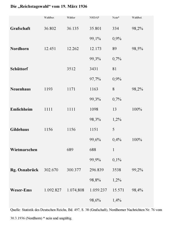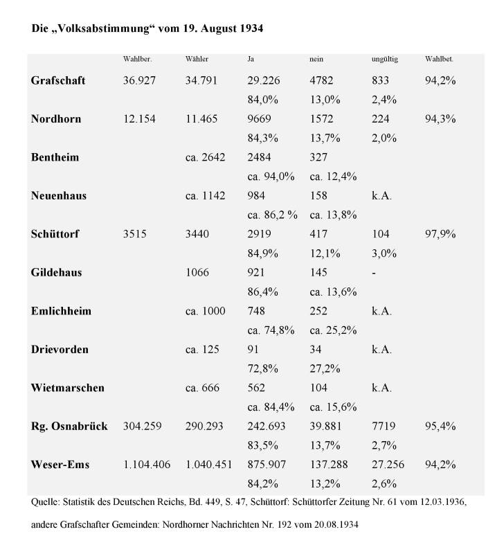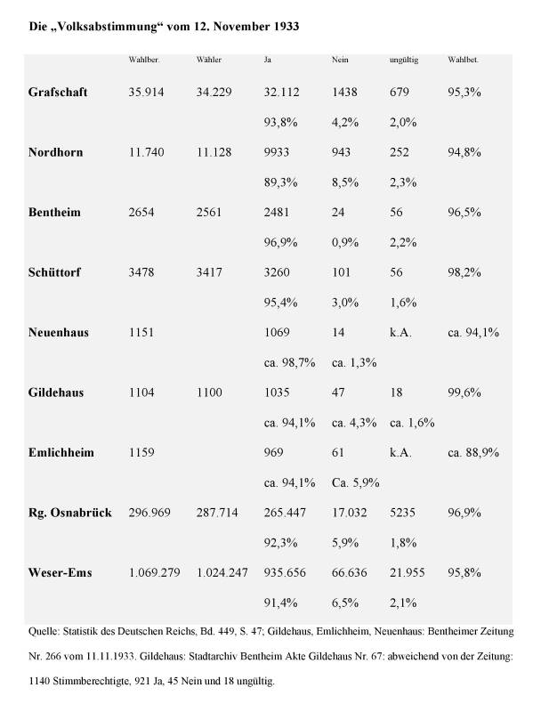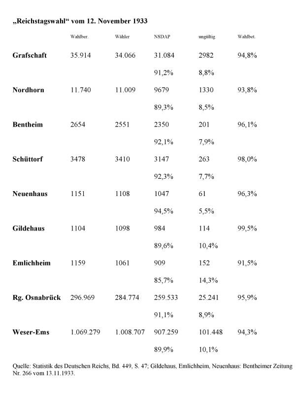 In der Grafschaft lag die Wahlbeteiligung dann bei 97,8 Prozent, damit deutlich über den Schnitt im Wahlkreis Weser-Ems mit 94,3 Prozent. Nordhorn hatte lediglich 93,8 Prozent Wahlbeteiligung, wobei auch noch 8,5 Prozent ungültig votierten. Höher war die Zahl der ungültigen Stimmen etwa in Gildehaus mit 10,4 Prozent oder in den altreformierten Hochburgen, so in Emlichheim mit 14,3 Prozent oder in Echteler, wo bei einer Wahlbeteiligung von 75,8 Prozent ganze 38,3 Prozent aller Wahlberechtigten ungültig votierten. Aber angesichts des insgesamt überwältigenden Votums, das natürlich nicht ganz ohne Zwang und Beeinflussung herbeigeführt worden war, titelte die „Schüttorfer Zeitung“ vom 13. November 1933 enthusiastisch: Das Bekenntnis zum Führer.