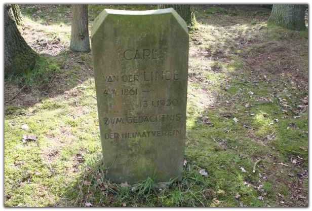 Im Januar 1930 fand auf diesem Friedhof auch der Dichter Carl van der Linde seine letzte Ruhestätte. Er war in Veldhausen geboren, hatte viele Jahre in Hamburg gelebt und gearbeitet, kehrte jedoch 1911 in sein Heimatdorf zurück. Er veröffentlichte viele plattdeutsche Texte, die auch heute noch gelesen werden. Der Grafschafter Heimatverein widmete ihm im Jahr 1971 einen Gedenkstein.