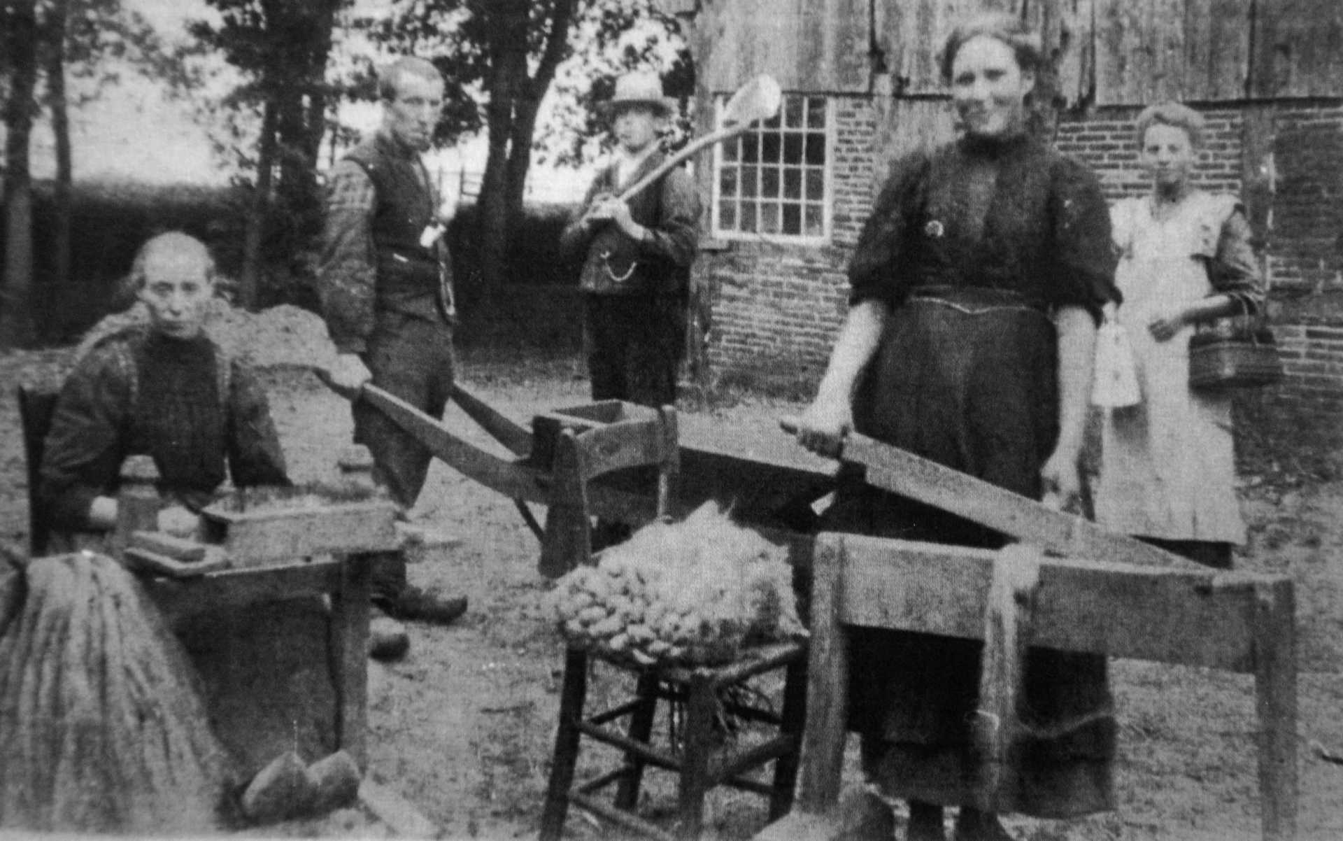 Flachsbearbeitung auf dem Hof Hoppen in Osterwald. - Bild: Archiv Heimatfreunde Emlichheim