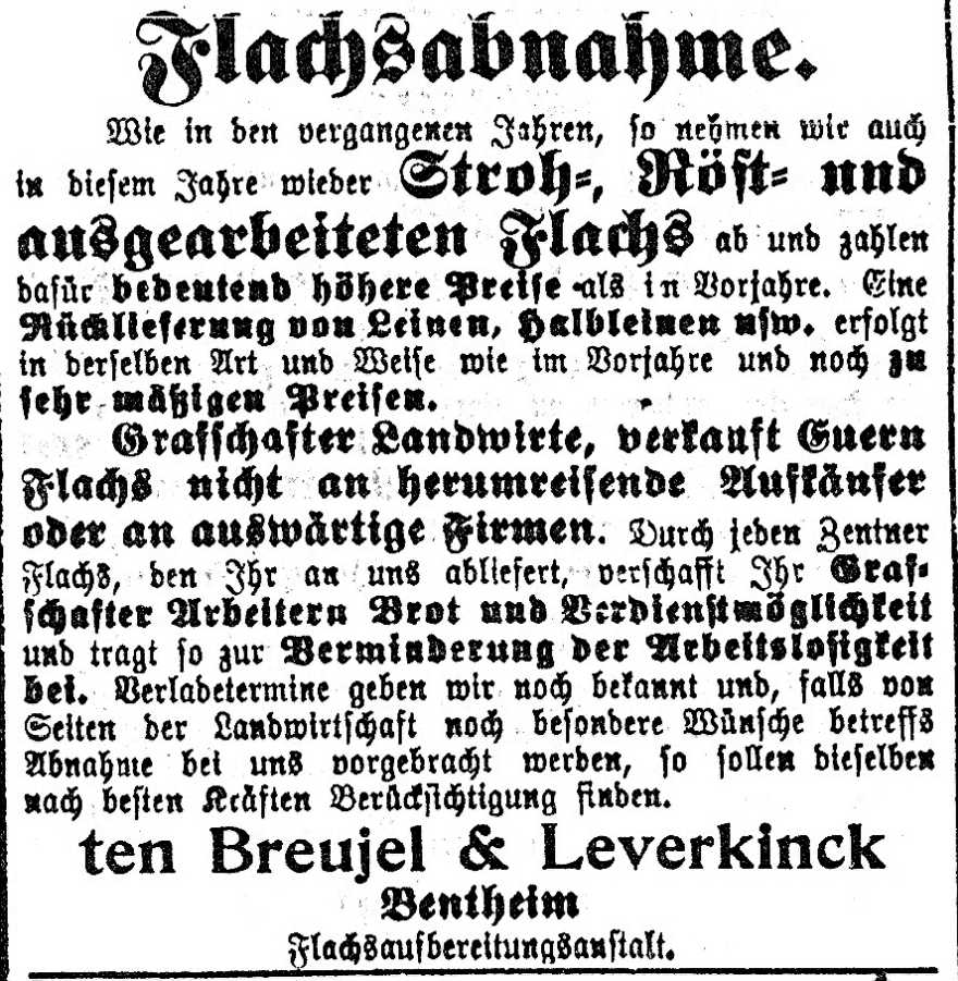 Wenngleich aus Flachs hergestellter Leinenstoff im Verlauf des 19. Jahrhunderts als Bekleidungsstoff weitgehend von der Baumwolle verdrängt wurde, blieb Leinen – quantitativ gesehen – als ein Nischenprodukt etwa für Tischdecken weiterhin gefragt, so dass bis ins 20. Jahrhundert der Flachsanbau im Bentheimer Land erhalten blieb. Er erlebte in Not- und Kriegszeiten immer wieder eine kleine Renaissance.