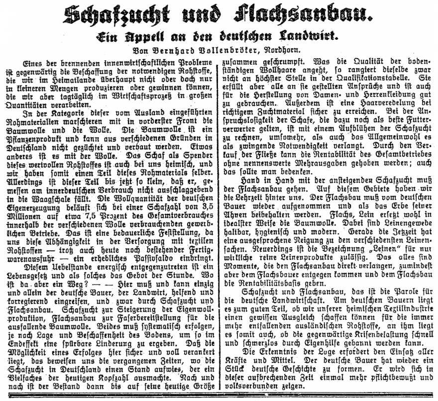 wieder vermehrt Wolle und Flachs für die Bekleidung zu herzustellen, um von der Baumwolllieferung unabhängig zu werden.